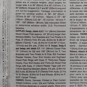 SWAGS & JABOTS: Pattern and instructions included for six window treatments. A,B: Right and left jabots are of unequal lengths. Jabot lengths for longer side: A is 36" (92cm); B is 50" (127cm); C is 90" (229cm). Drapes D,E,F are 90" (229cm) long and are cut-by-suggestion. Yardage information is given for window widths: A: 36"-50" (92cm -127cm); B: 50-72" (127cm-183cm); C: 72"-90" (183cm-229cm); D,E: 50"-75" (127cm-191cm); F: 120"150" (305cm-381cm). See Instruction Sheet to determine window width. D,E: Purchased tiebacks.