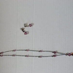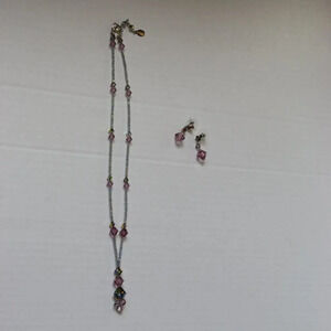 Stunning necklace with matching earrings. Pink sort of aurora borealis stones. I believe this necklace is crystal but I am not an expert.