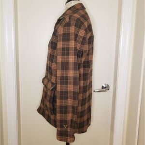 Black & Mustard Brown Checkered Plaid snap buttonup Flannel Skate Jacket with Dual front flap slash Pockets, Limited Edition Bullet Collection Collab, by Volcom & Anti Hero.