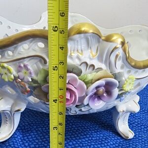 Vintage Dresden Footed Reticulated Bowl, PMP 1817, Hand Painted, made in German Democratic Republic. This stunning piece in the Rococo style of porcelain manufacturing of early German porcelain makers is hand signed by the artist: D. Schupp. Unlike some of the other footed Dreslen bowls this in more unique as it has heavy gold gilt around the rim and throughout the piece that surround a beautiful cabbage rose hand painted in the middle.