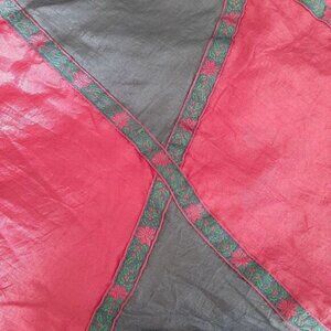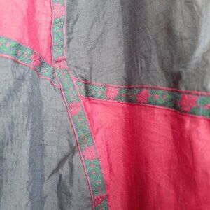 • Long dolman sleeve full zip lined jacket in burgundy and navy blue patchwork design.