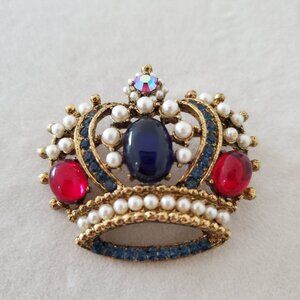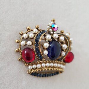 Vintage WEISS Signed Royal Crown Brooch Pearls Cabachon Aurora Borealis Goldtone