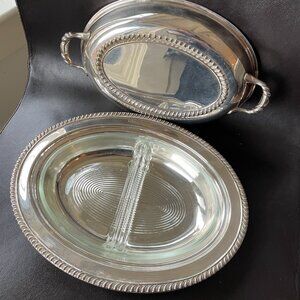 Vintage 80s W.M.Rogers Silverplate Oval 12" Covered Serving Bowl Dish with Handles. Has the original 2 section glass insert. Rare to see these with an insert.