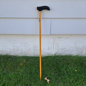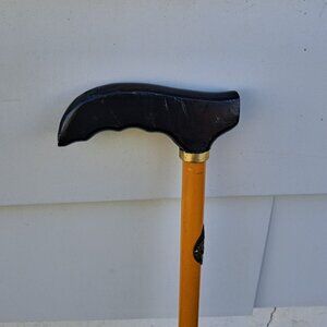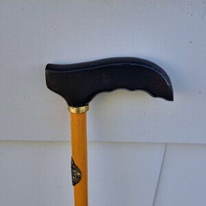 A wooden walking stick or cane made in Germany. It has a metal plaque with the picture of a home and "Luneburg Heide," which is am area in the Saxony region of Germany known for its heath and walking trails. There is some wear; the cane is 35 3/4" long and just under 3/4" in diameter.