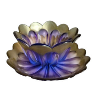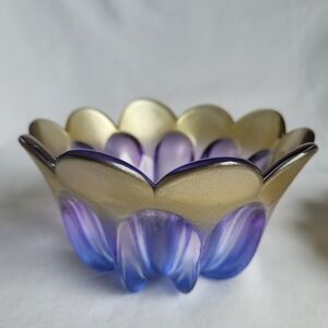 This set is a lovely flower/tulip shaped art glass bowl with plate in an iridescent lilac (purple) with gold edging. The piece is unsigned and has no mark or labels but appears to be Walther Glas which is made in Germany.
