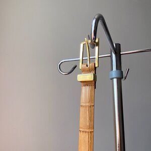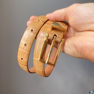 Minimalist 90s slim belt in beige-toned leather with bamboo-style texture and gold buckle. Vintage piece by brand Albatros.
