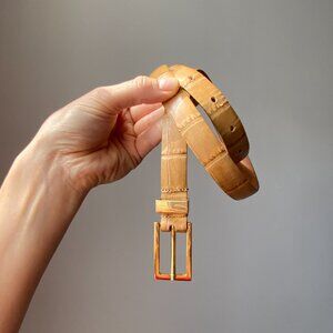 🍂 Vintage Warm Yellow Bamboo-Textured Japandi Leather Slim Belt Gold Buckle