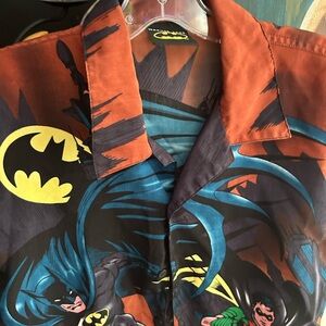 Dynamic Batman logo shirt. Features rust and blue tones. Iconic design by Warner Bros.