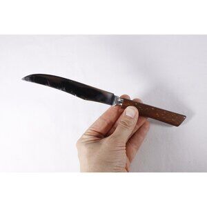 A great looking set of 6 wood-handled steak knives, marked Warranted Sheffield, Stainless Steel. With some marks of age and age, including some surface cracking to the handles. The wood is a nice warm mahogany tone base with lighter flecks. Size: ca 8.6 inches (22 cm) long