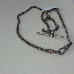 A vintage watch chain can be wearn as a necklace, featuring a classic curb-link chain in a warm antiqued brass/bronze tone. The centerpiece is a traditional T-bar pendant, giving it a strong Victorian/Edwardian pocket-watch aesthetic. Wears beautifully as a choker-length statement piece.