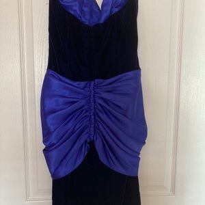 Navy velour strapless dress by Wayne Clark with silk-like accents at the hips. Made in Canada.