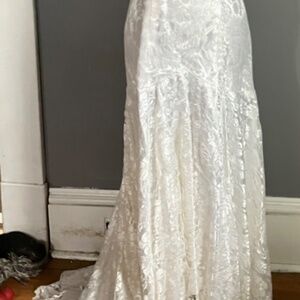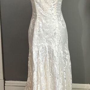 Elegant, off white, lace over satin; quarter inch straps, zipper back; seed pearl and sequin detail throughout; very small “train”. Note that this is size 6 “wedding dress size” which is usually about 2-3 sizes smaller.