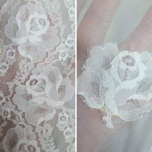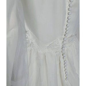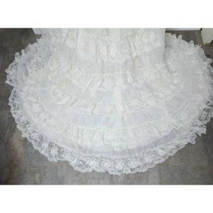 Full skirt bottom with the same sheer chiffon like material and vertical lace detailing and lace floral appliques.