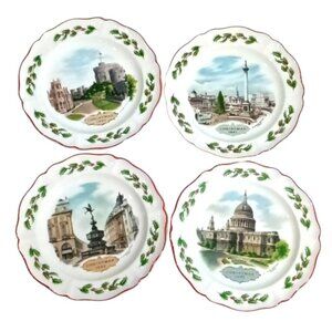 This collection of creamy coloured plates includes a total of seven in a series of Queen's Ware Christmas Plates (4 are offered here). All plates in this series show views of historic buildings in London. All plates are 8.25 inches or 21 centimetres in diameter. All the plates have a description of the London scene on the reverse side.