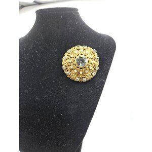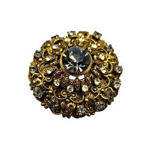 Vintage West Germany Filigree Brooch Gilt Brass Clear Rhinestones 1940s