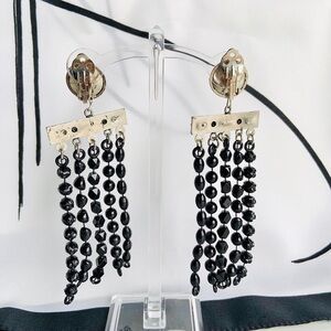 Each earring has 5 strands of differently shaped plastic black beads; round twisted rope metal clips.