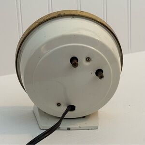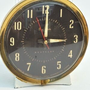 Condition: There is some minor paint wear on the base and tarnish on the gold trim. The hands have some slight discolouration. The cord has a bit of paint on it. There is a bit of rusting where the clock face meets the base, but it is not noticeable unless you look very closely.
