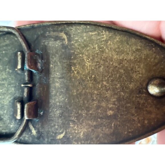 This vintage brass belt buckle features an intricate ornate design with a classic oval shape, making it a sophisticated accessory for any wardrobe.