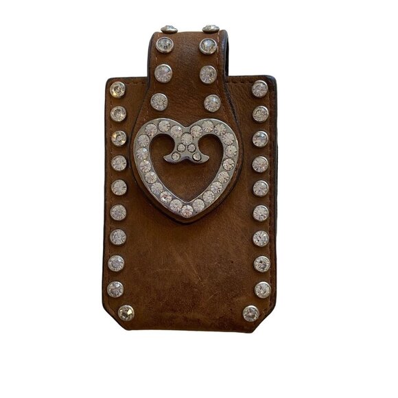 Item keywords: Western holster, leather case, rhinestone heart, belt clip, brown leather, holder, Nocona brand, cowboy style, studded case, rustic accessory, silver accents, secure fit, cowgirl fashion accessories, VTG