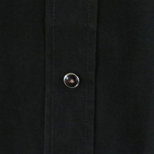 Up for sale is a vintage western shirt by MWG. It has a black base colour. The upper portion on each side of the front of the shirt has a wagon wheel design stitched in yellow and blue. The buttons on the shirt are black pearl snaps. What a great vintage shirt do not miss out on it.