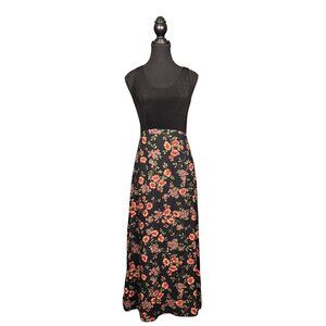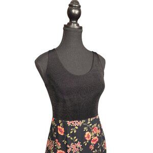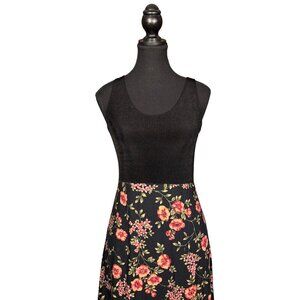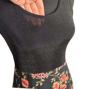 This vintage Code One maxi dress is pure 90s whimsigoth magic. The fitted black ribbed knit bodice is semi-sheer (perfect for layering with a bralette or camisole), flowing into a romantic black skirt adorned with deep red, pink, and green floral patterns. The silhouette is fitted through the bodice and waist before flaring into a sweeping, ankle-grazing hem.