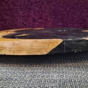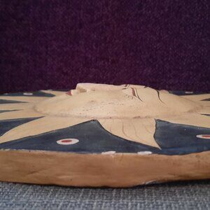 It is hand painted and has some worn and chips. The sun and moon motif are carved in and raised.