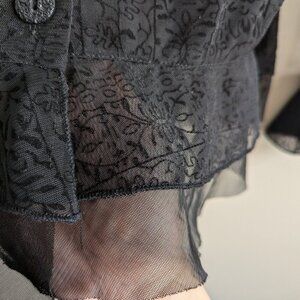 Easywear By Empress Y2K / Vintage sheer mesh blouse with peplum hem. Goth Wednesday bives with interesting textured buttons and tiered peplum hem. Ruffle collarline. Flutter wrists. Material tag cut out. Leaf patterned mesh/lace.