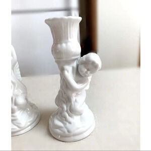 This charming pair of white porcelain candleholders features adorable cherubs/angels embracing the candlestick stems. Each figure has delicate wings and sweet facial features with a classic Victorian-inspired design. The candleholders showcase beautiful glossy glaze with intricate textured details and fluted tops that create an elegant silhouette.