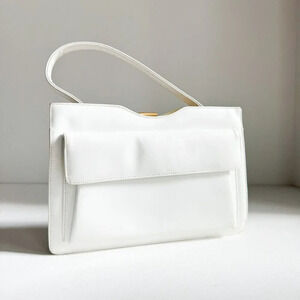 Elevate your fashion game with this vintage-inspired top handle bag. The chalk white faux leather exterior exudes elegance and sophistication, while the brown lining adds a touch of rustic charm.