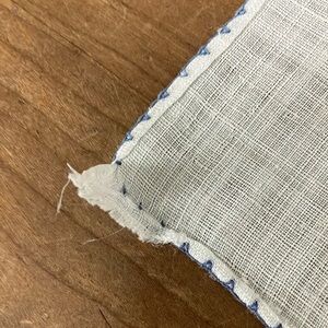 AI description: Charming set of two white handkerchiefs. One features a delicate lace edge. The other has floral embroidery with blue stitching.