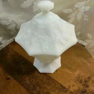 Vintage White Milk Glass Pedestal Covered Compote, Grape and Leaf pattern