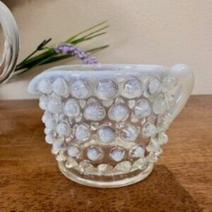 Featuring a luminous white opalescent hobnail design with a pedestal base on the sugar bowl—this set channels classic Fenton-style charm with mid-century flair.