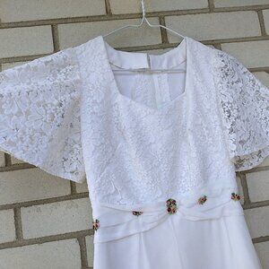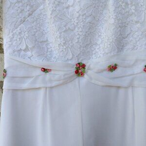 Vintage White Party Dress 29" Bust Bridal Gown Lace Flounce Sleeves Pink Flowers