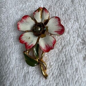 Vintage White & Red Enamel Antique Flower Brooch Pin