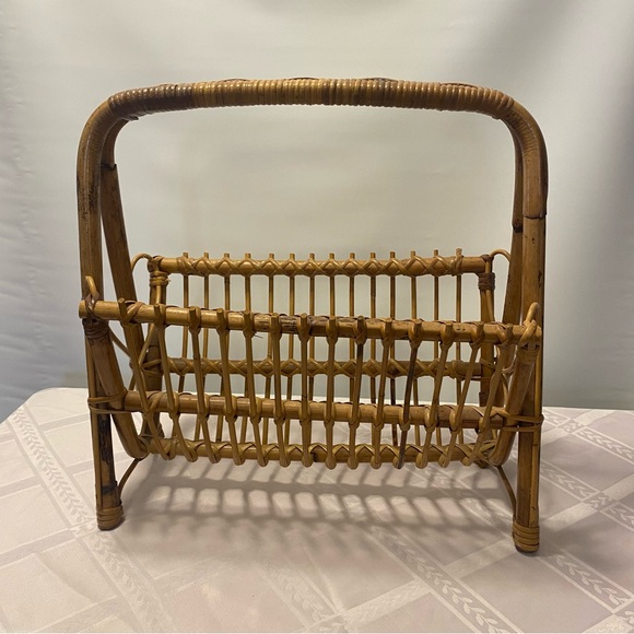 Charming wicker magazine rack with a natural tan color. Perfect for organizing magazines or newspapers.