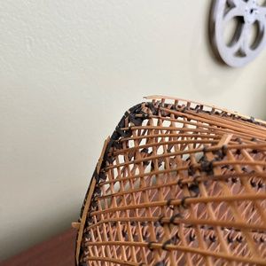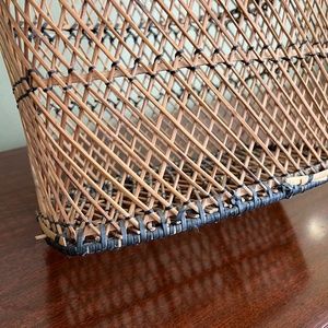 Lovely pair of vintage baskets with hanger / handle. One is slightly larger than the other, both have imperfections- please see photos. Larger of the two is 15.75" x 9.5" x 5.5", smaller is 13" x 8" x 5".
