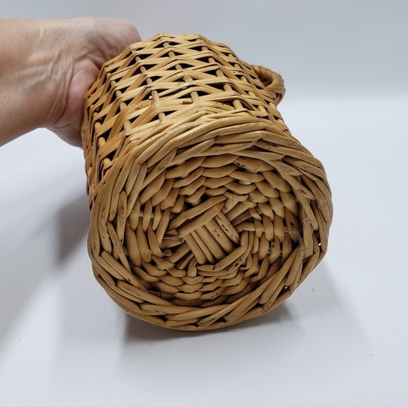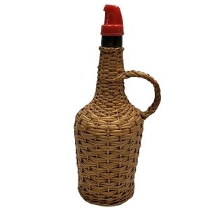 This is a wicker-covered glass bottle with a red plastic pour spout. The bottle is approximately 13 inches tall. The wicker is in good condition with no visible damage. The glass bottle is dark green. The pour spout is red plastic and has a small hole in the top. The bottle is in good condition with no visible imperfections. It is a vintage item and would be a great addition to any kitchen or bar.
