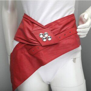 Elevate your outfit with this Vintage Wide Red Leather 80s Wrap Belt, a true statement piece that exudes retro charm. Crafted from high-quality leather, this belt features an asymmetrical design that adds a unique touch to any ensemble. The striking red color is sure to catch the eye, making it the perfect accessory for any party or special occasion. Embellished with jeweled accents, this corset-style belt adds a touch of glamour and sophistication to your look.