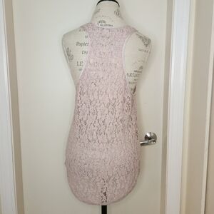 Mauve Pink Floral Crochet Lace Racerback Sleeveless Top with pink Silk Trim, by Wilfred from Aritzia.