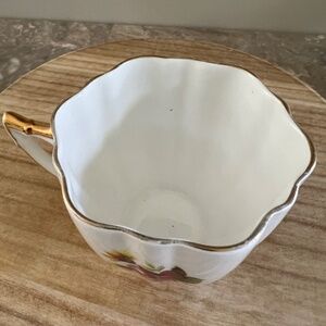 An elegant bone china set featuring cabbage rose flowers in hues of rich, deep plum & yellow. Scalloped cup bowl, trimmed in gold colour (some fading). Cup still 'pings'. #2580/86. No chips/cracks and from a smoke free home.