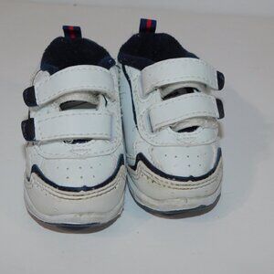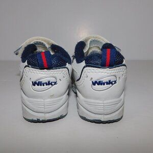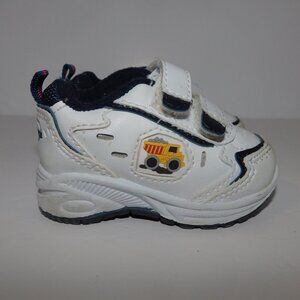 This pair of Vintage Winkz baby size 2 (3.75" insole) Dump Truck Construction Theme Running Shoes Sneakers are in good clean condition. Shoes are white with blue detail and a image of a dump truck full of rocks on each outer side of shoes. Rubber sole.. Hook Loop Strap closure.