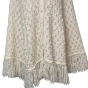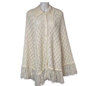 Vintage Winter White Knit Poncho Cape Button Front Fringe Hem Acrylic