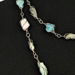 This vintage necklace is beaded (sort of) and is one long, continuous strand without an opening. The necklace features 30 natural stones in a variety of sizes, shapes, and colours, each wrapped in a silver tone metal "cage". I'm not completely sure what all the stones are, but it appears to me that there is larimar, pink opal, green and blue aventurine, sea glass, and quartz. I could be completely wrong, but at the very least there are several different types of natural stones. Zoom in and see what you can see! The necklace has normal wear, including some minor tone change where the metal joins, but there are no issues affecting wearability. I've seen similar (nearly identical) necklaces listed as being sterling silver wire, but I can't confirm that here.