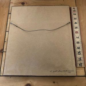 Vintage completed & framed needlepoint embroidery picture shows a woman seated in a chair. Dated 1974 on the backing paper with writing that reads "A gift from Gretta Aslak". Framed under glass, frame size is 11 3/4" & 13 1/2". Pre-owned completed needlepoint embroidered picture, wood frame has a few small marks/scrapes from display and storage.