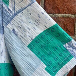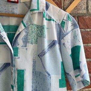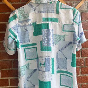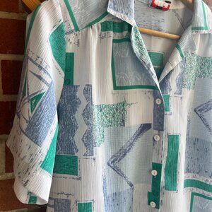 Vintage Women's Blouse - Short Sleeve Button Down Alie Petite White, Green and Blue Abstract Top