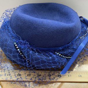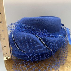 Vintage Women's Blue Mesh Veil Pillbox Fascinator Cap w/ Rhinestone Bow and Lace