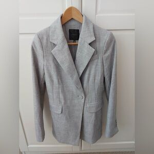 A sophisticated vintage longline blazer jacket from Francesca Mammoliti for Beker Fashions Toronto. It features shoulder pads for a structured silhouette, full button closure, zippered pockets, and full lining. The thicker material makes it ideal for spring or fall outerwear, or as a winter weather blazer. Classic minimalist tailoring with timeless appeal.