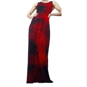 Vintage women's corset back maxi dress in black, red, and abstract ombre.