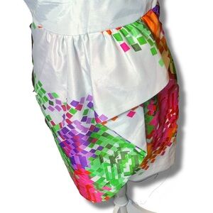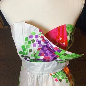 Chic strapless dress with geometric design. Features vibrant green and pink accents. Ideal for a bold look.