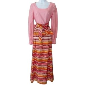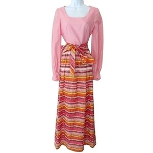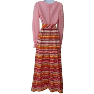 Vintage pink, orange, and yellow prairie peasant dress with stripe and ruffle sleeve details.